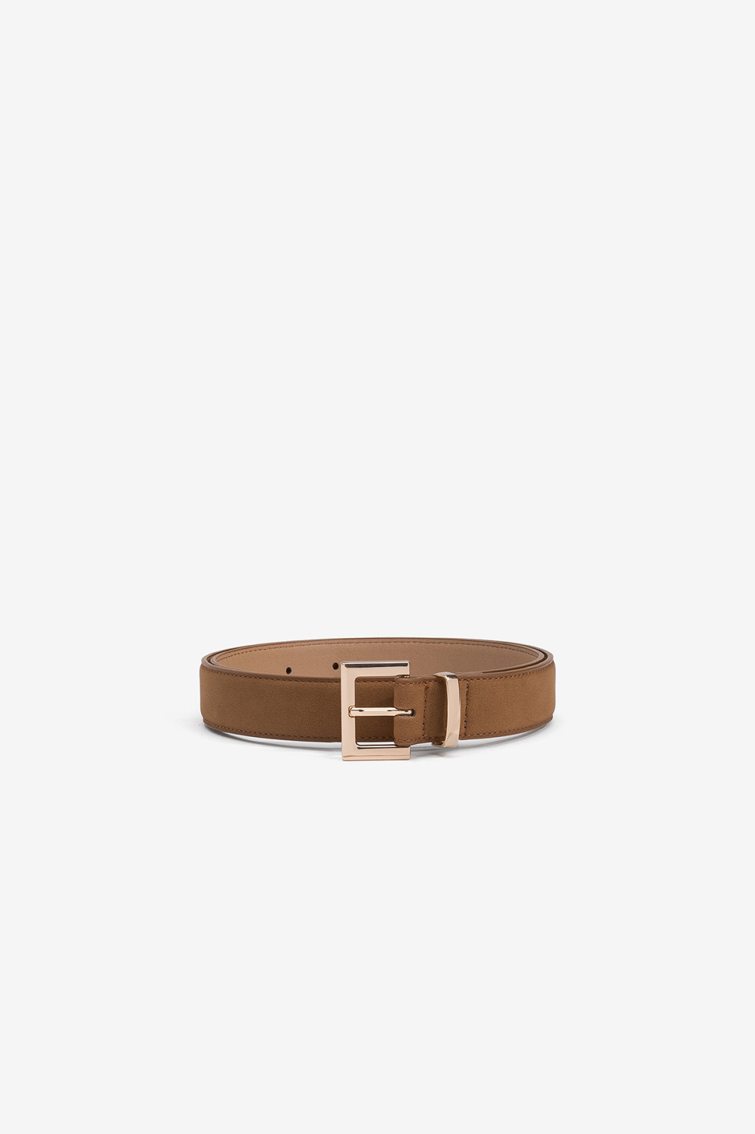 Cinto efeito camurça com fivela metálica retangular.