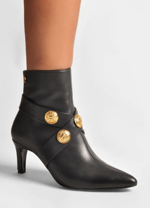 Bota de salto , com aplicações douradas e em pele preta.